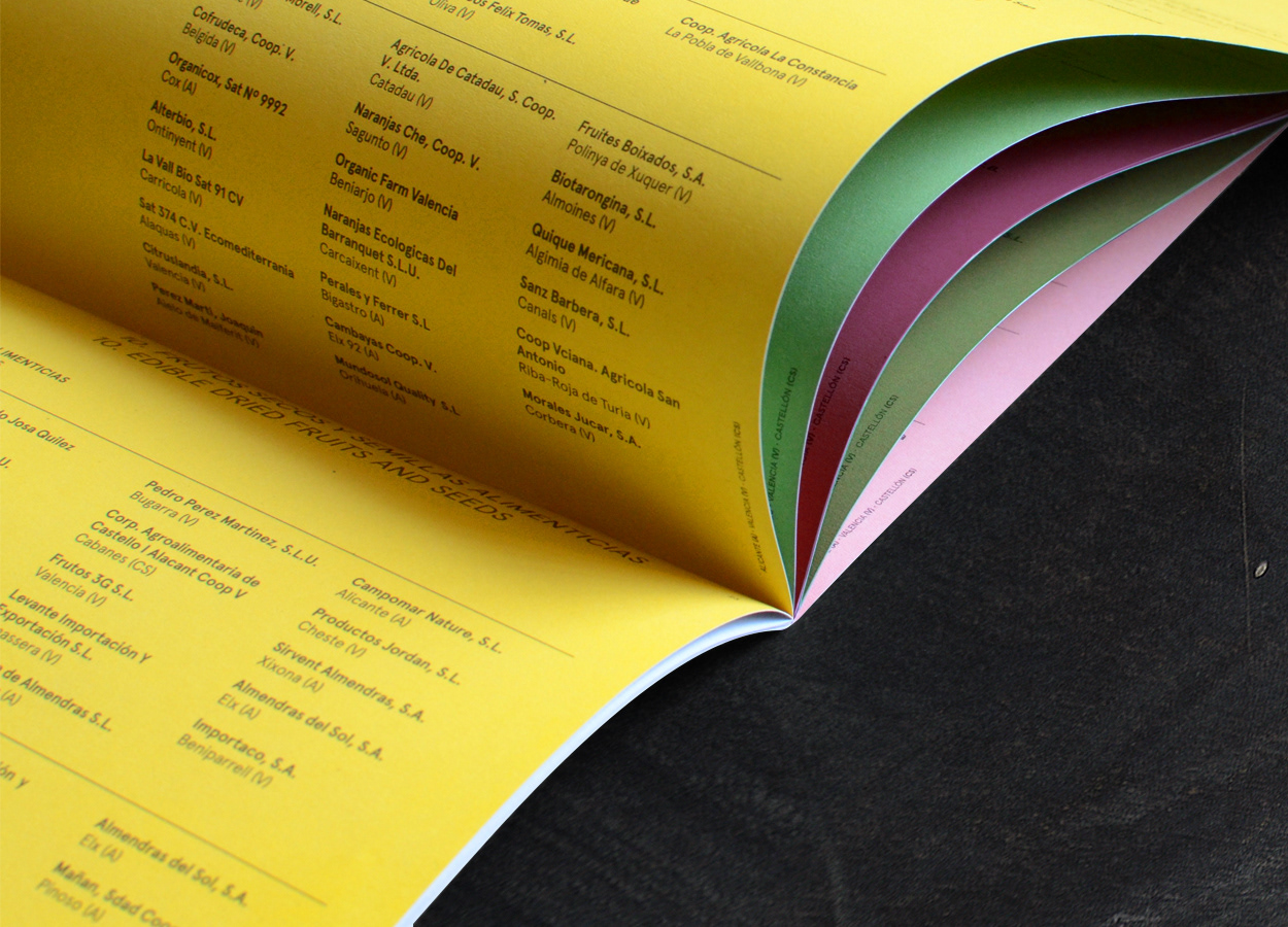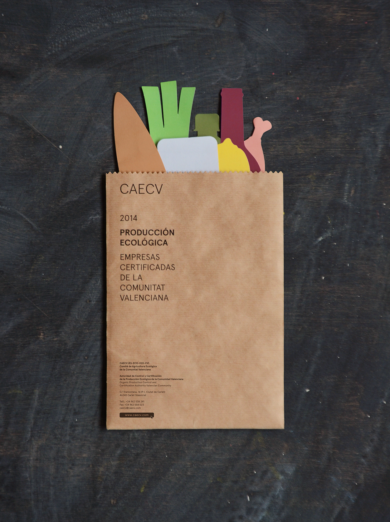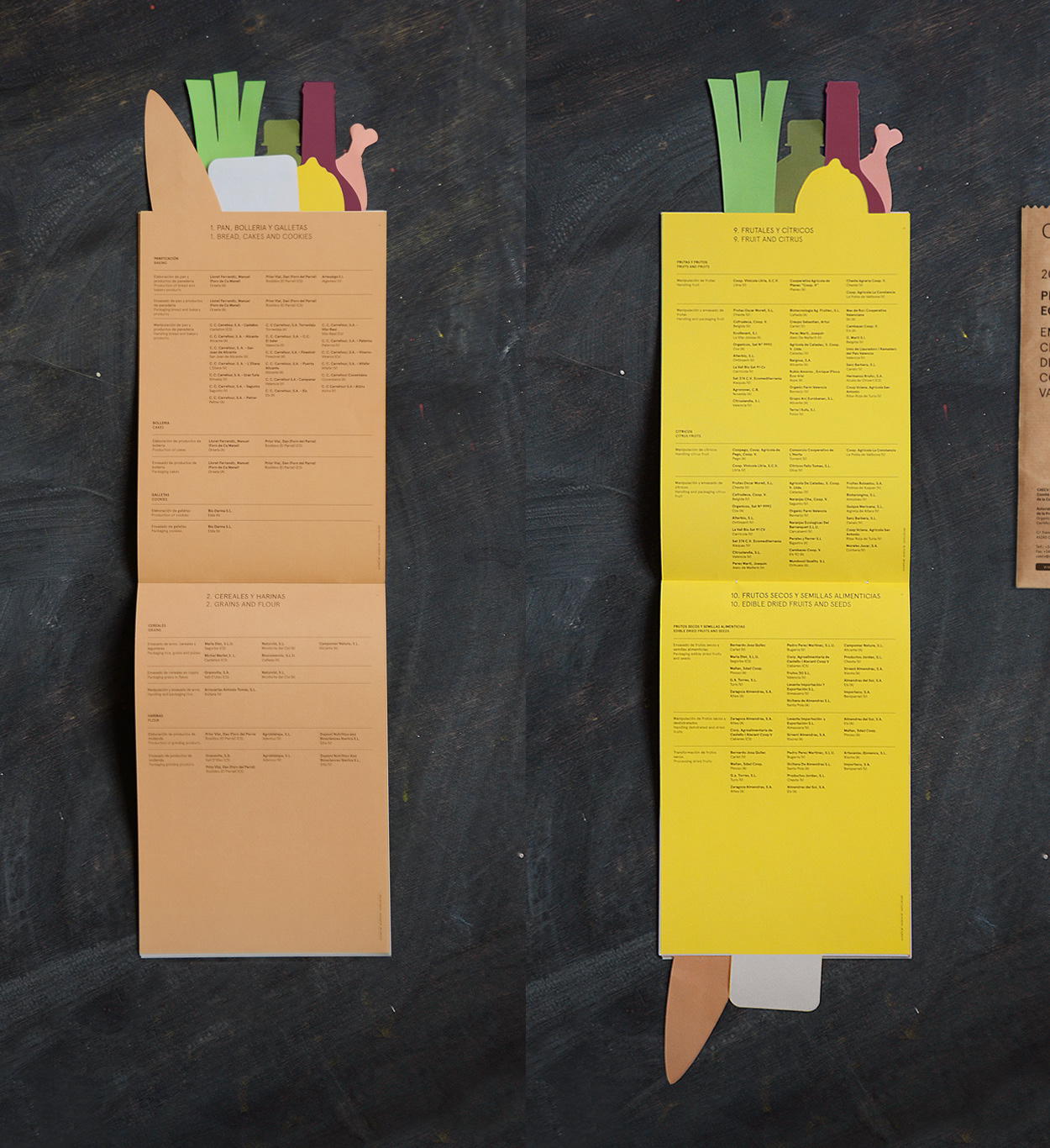 In order to communicate the extensive list of certified companies in the Valencian Community for the European market, they needed a brochure that would facilitate the classification by sectors and at the same time stand out at trade fairs. The concept is based on the consumption of organic products, a paper bag containing various foodstuffs. These, in turn, act as dividers to classify the companies in their corresponding sector.
