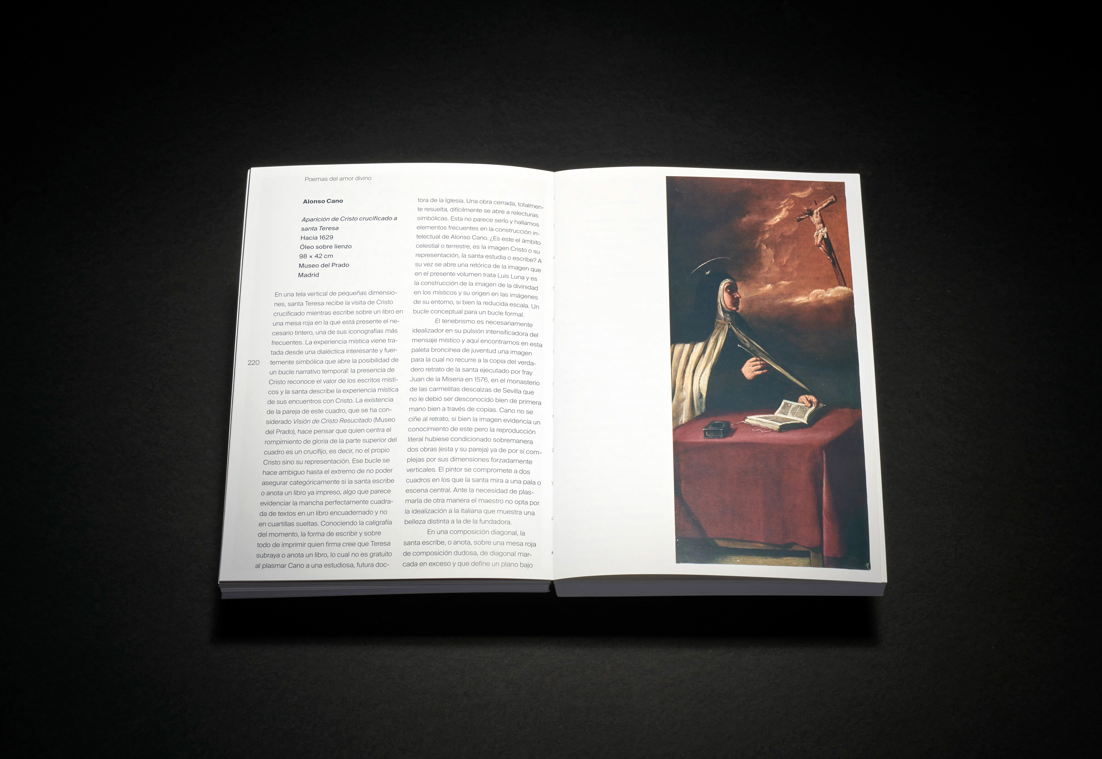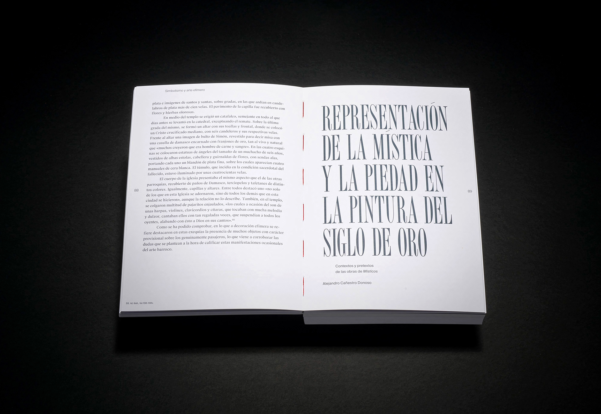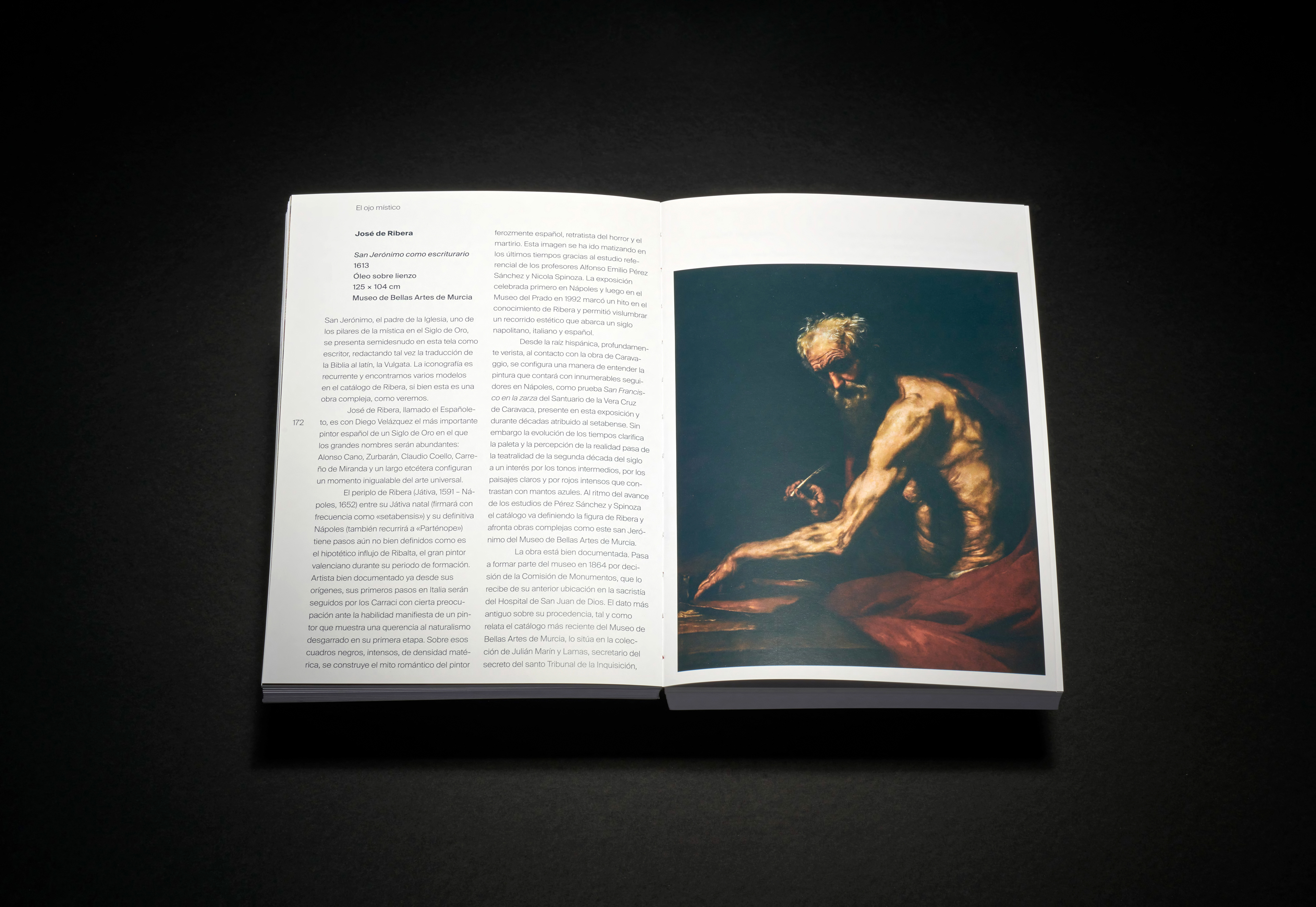 The catalogue was conceived as a volume that shows its guts. The content is divided into two parts. The first part studies the relationship between mysticism and art through a series of articles by various authors. The second part shows the works of art in the exhibition, with commentaries on five thematic blocks. In terms of design, these two parts share many of the same layout features, but they differ above all in typography and in the treatment of the spaces, which are more comfortable to read in the articles and much more visual in the files.