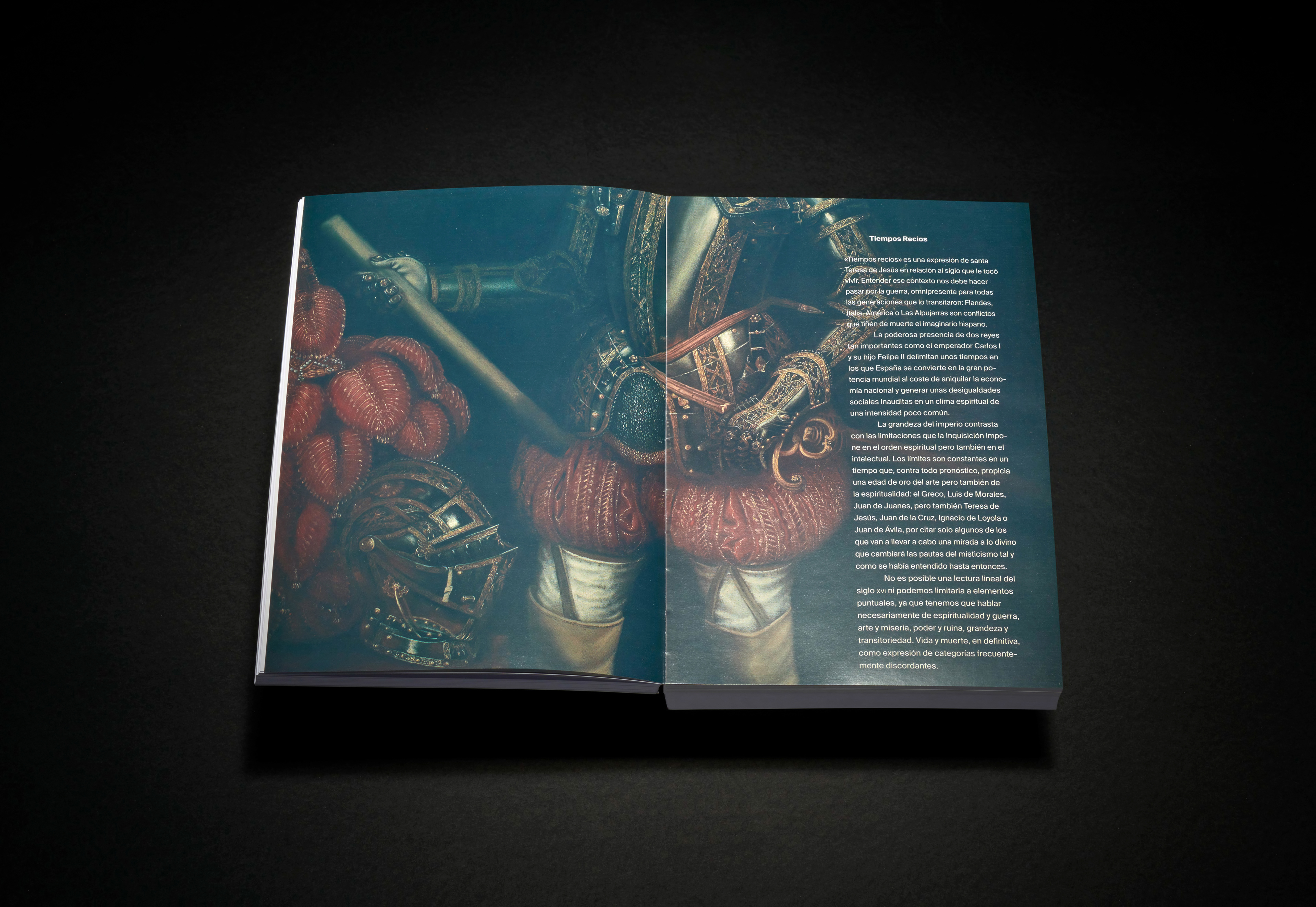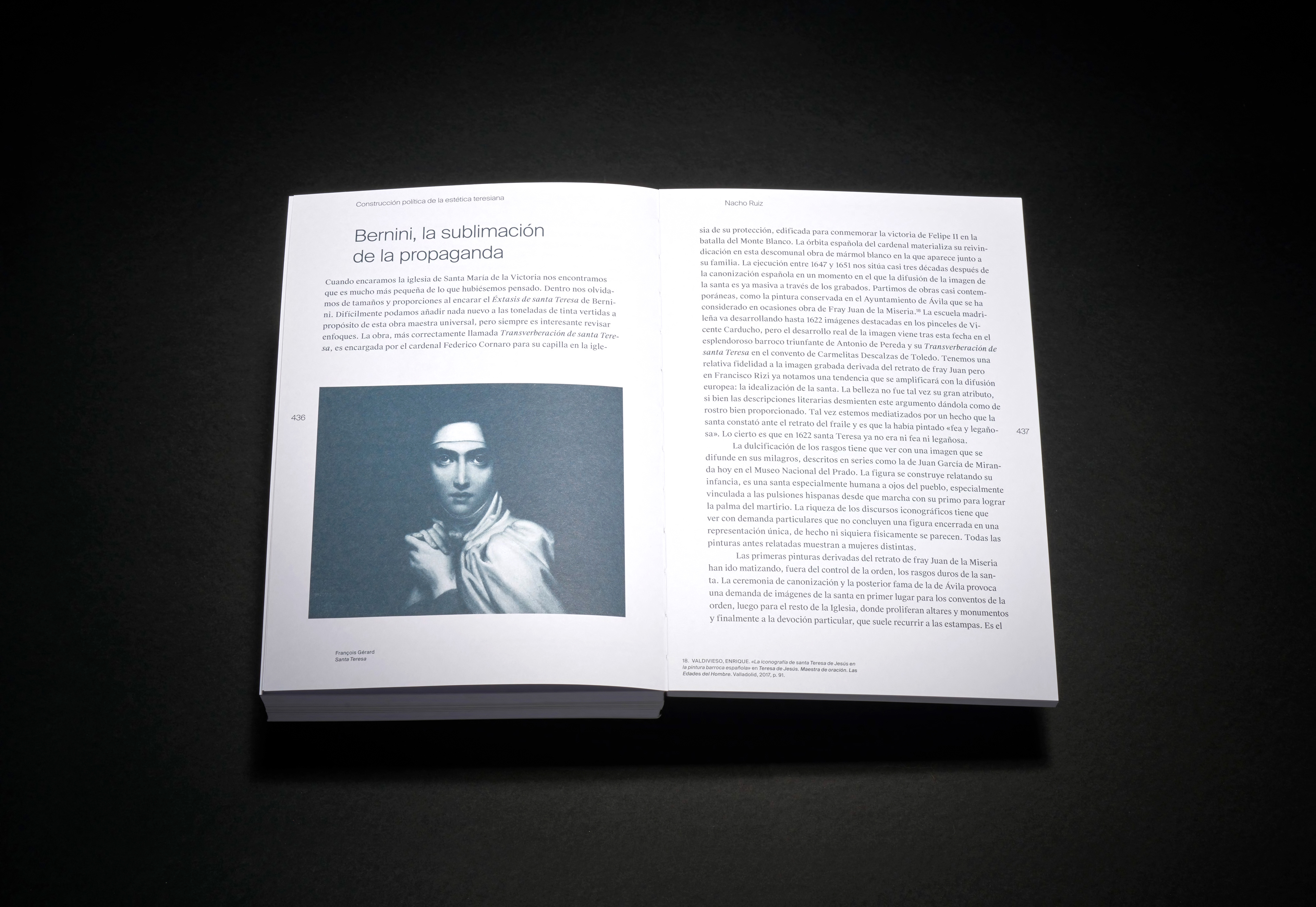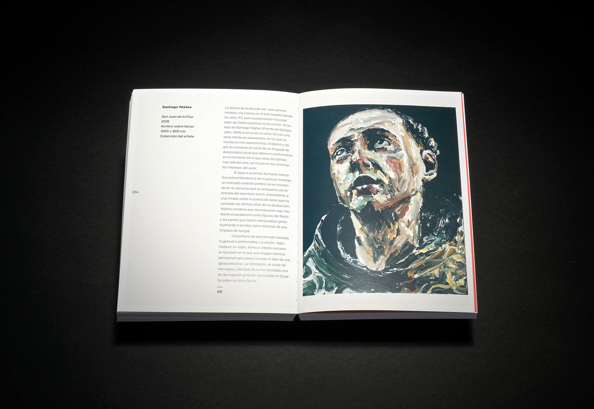 The catalogue was conceived as a volume that shows its guts. The content is divided into two parts. The first part studies the relationship between mysticism and art through a series of articles by various authors. The second part shows the works of art in the exhibition, with commentaries on five thematic blocks. In terms of design, these two parts share many of the same layout features, but they differ above all in typography and in the treatment of the spaces, which are more comfortable to read in the articles and much more visual in the files.