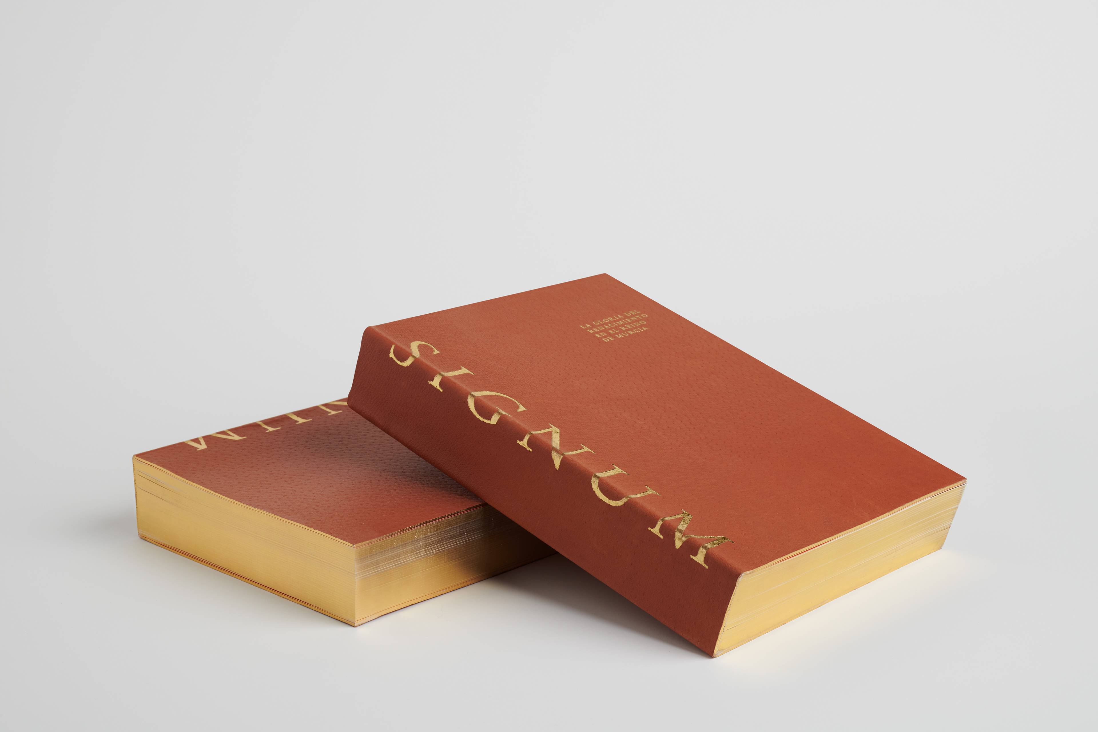 Immersion in this period of art history has led us to investigate the first printed books, also from this period. Many of the resources that have shaped the book as we know it today can already be found in the work of Aldo Manucio's printers. This is the starting point for the graphic design of the exhibition and the Signum catalogue, where, while respecting the work of the master typographers, an updated revision of the Renaissance book has been proposed. This inspiration is completed by the exclusive use of the "Bembo" typeface family devised by Francesco Griffo in 1495 for one of Manucio's printed books and taken up again in 1929 by Monotype.